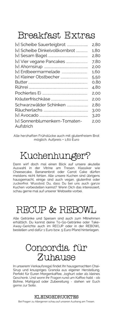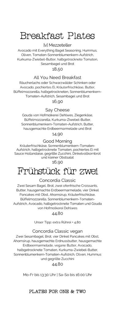 Unser Café Concordia ist von Montag den 02.03 bis Freitag den 06.03 geschlossen. Am 07.03 sind wir mit einem frischen Gastraum, neuen Bestellkonzept und unseren Frühlingsgerichten auf der Speisekarte wieder für euch geöffnet!